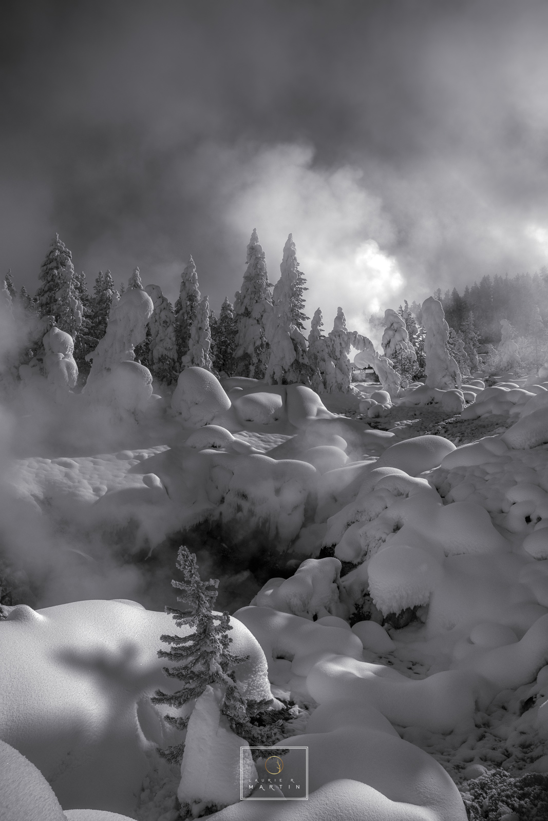 There are many places closed in Yellowstone during the winter season. Most places, if open, can only be reached by special vehicle. It takes many many trips out in the freezing cold to fully discover the best of Yellowstone in the winter. This is costly and also not easy. Subzero temps, equipment malfunctioning and challenging snow are only a few things to mention. Getting an image like this takes a lot of years of practice, research, and trial and error. I cannot begin to tell you how much goes into getting this right. I love this image and yet I would still go back to do it a bit different. Not the easiest of places to reach and also not the safest at times, all weather permitting. You could go here a bunch of times and never get on this trail. This one is a very rare one because trail is almost always closed in the winter. One step off the trail and you could quickly be down chest high in snow. Each step you have to pack your feet down before you take another step. Its a slow grind with a very limited space to set up and work. Photo © copyright by Laurie R. Martin.